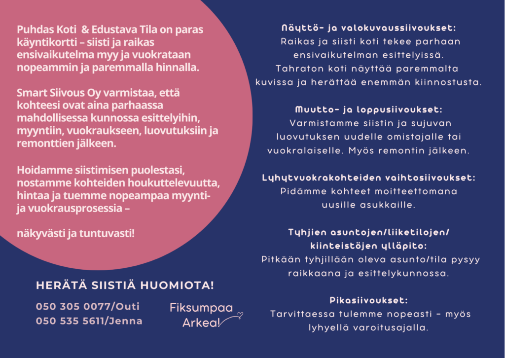 Smart Siivous Oy tarjoaa ammattitason puhdistuspalvelut kiinteistönvälitykseen ja vuokraustoimintaan Kokkolassa ja lähialueilla. Autamme kiinteistönvälittäjiä, sijoittajia, yksityisiä vuokranantajia ja yrityksiä tekemään fiksumman sijoituksen siiteyteen ja puhtauteen.